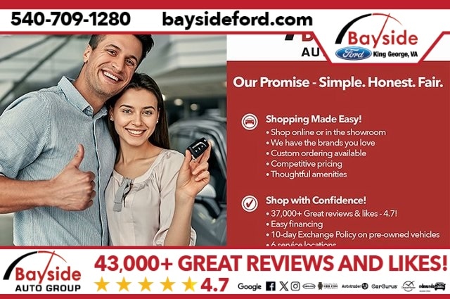 Call/Text us @ 804-986-4206 to schedule your appointment or visit us at 17020 Consumer Row, King George, VA 22485 Our promise - Simple. Honest. Fair. On all vehicles we offer the Bayside VIP BAYSIDE MAINTENANCE, which includes service coupons, multi point inspections, complimentary diagnosis, engine loyalty for qualifying vehicles, a 10 day exchange policy, & a 3 month/3,000 mile powertrain warranty from the time of purchase for peace of mind. This entry level package provides a ton of value and shows our commitment to our customers and community. Bayside Ford in King George, VA, is proud to serve Fredericksburg, Stafford, Spotsylvania, Tappahannock, Bowling Green, Dahlgren, and Colonial Beach communities as the leading dealership for customers looking for a new or pre-owned Fords as well as used vehicles. Every day our attentive sales representatives, financial experts, and our certified technicians work toward the same goal - to provide you with the best customer service experience and make sure you are 100% satisfied with your experience at our dealership.Internet price includes: $2000 Bayside Ford Credit finance incentive and $2000 trade in assistance for retail trades. Must finance at least 80% of the full balance(before any cash down payment) to realize the full BAYSIDE FORD online discount. Used vehicles that are traded and/or purchased from manufacturer auction sales may incur a reconditioning fee based on the service that needs to be performed to the vehicle once it arrives to the dealer. Customers do have the ability to waive the reconditioning fee of the vehicle and purchase the vehicle for the pre service advertised BAYSIDE PRICE prior to reconditioning.